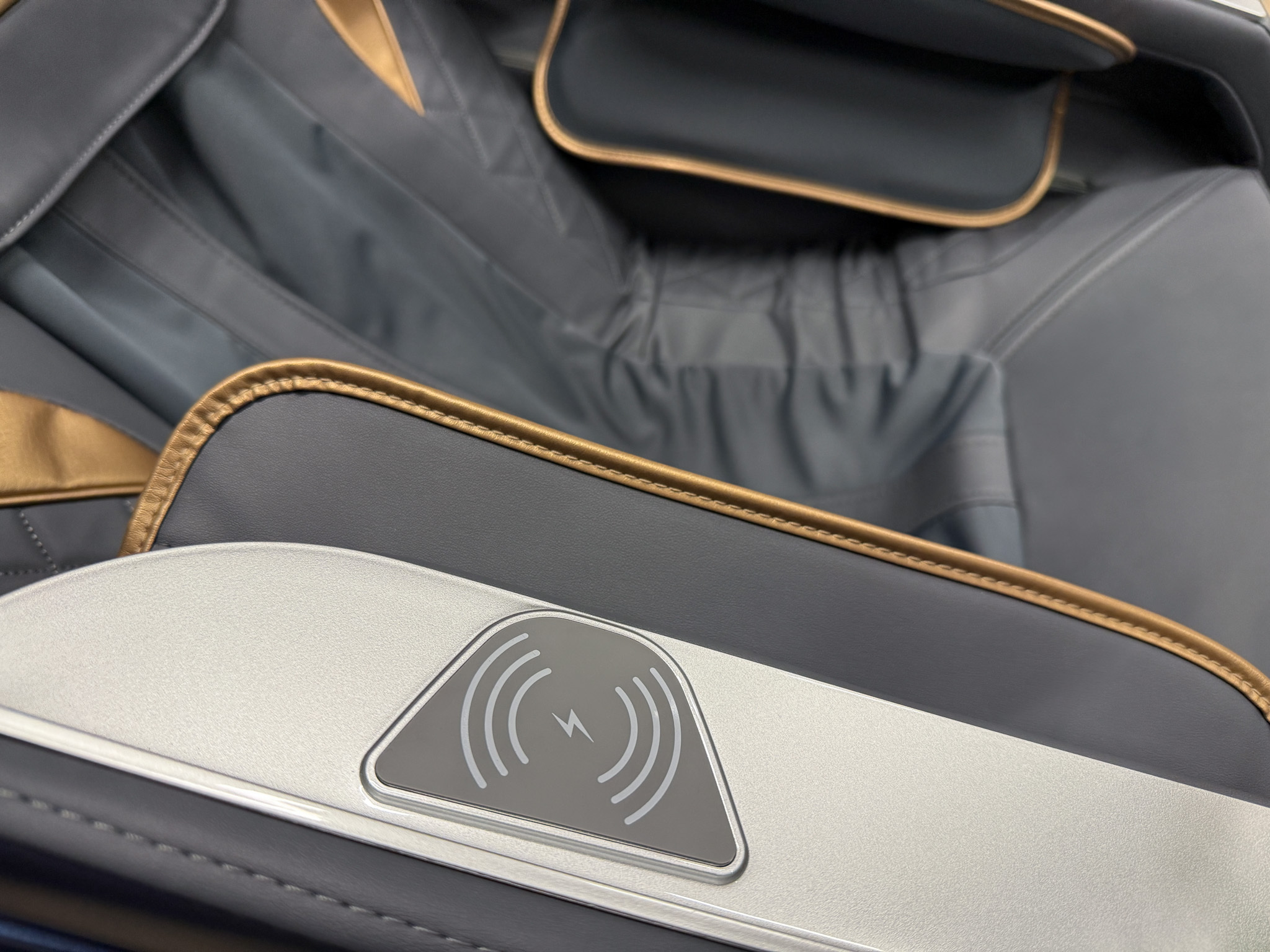 На правом подлокотнике встроен модуль быстрой беспроводной зарядки вашего смартфона. Панель для зарядки прорезинена , поэтому смартфоне будет скользить или царапать лакированную панель.