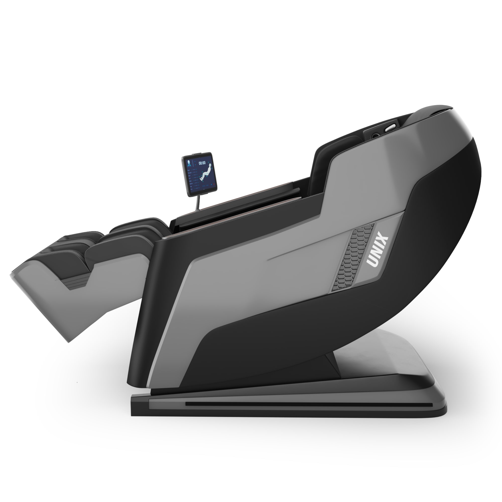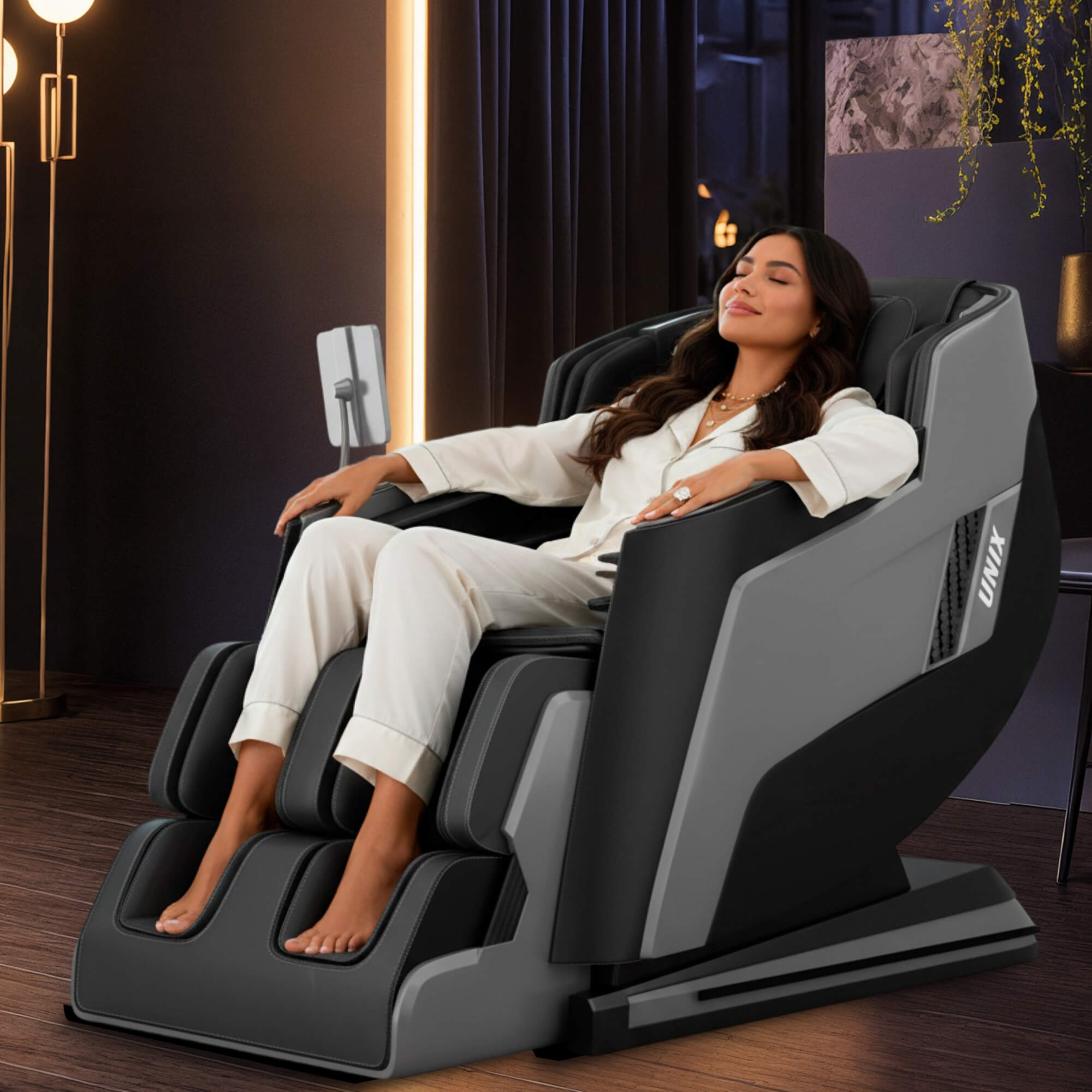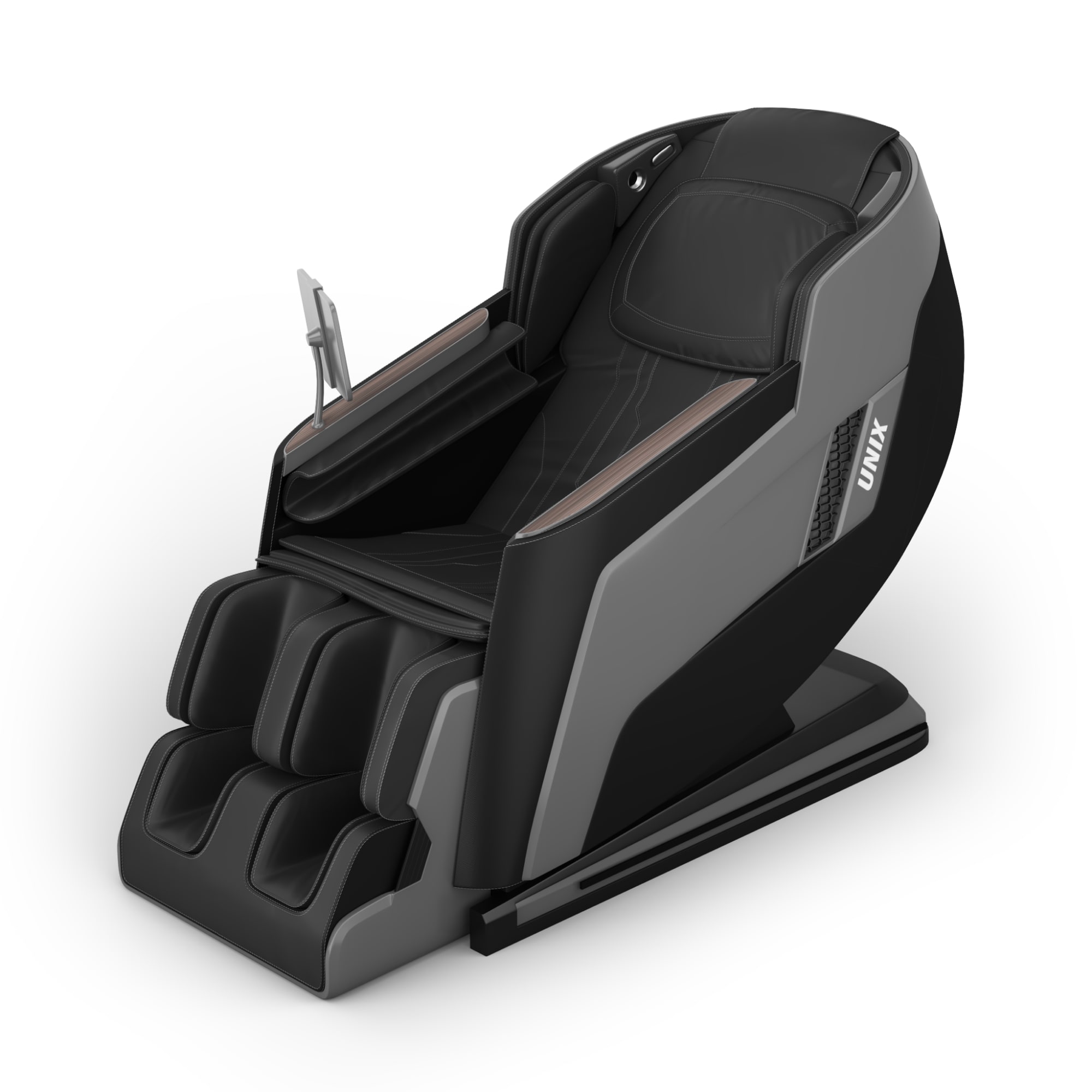 - Воздушно-компрессионные подушки делают массаж ног, икроножных мышц и рук. Они подстраиваются под анатомию пользователя, что поможет быстрее снять неприятные ощущения в мышцах. В массажном кресле UNIX Med Afelia предусмотрена функция роликового массажа ног и массажер для икроножных мышц. Автоматическое выдвижение подставки для ног, а также функции роликов для поднятия и опускания стопы поможет расслабиться после активного дня и борьбы со стрессом.