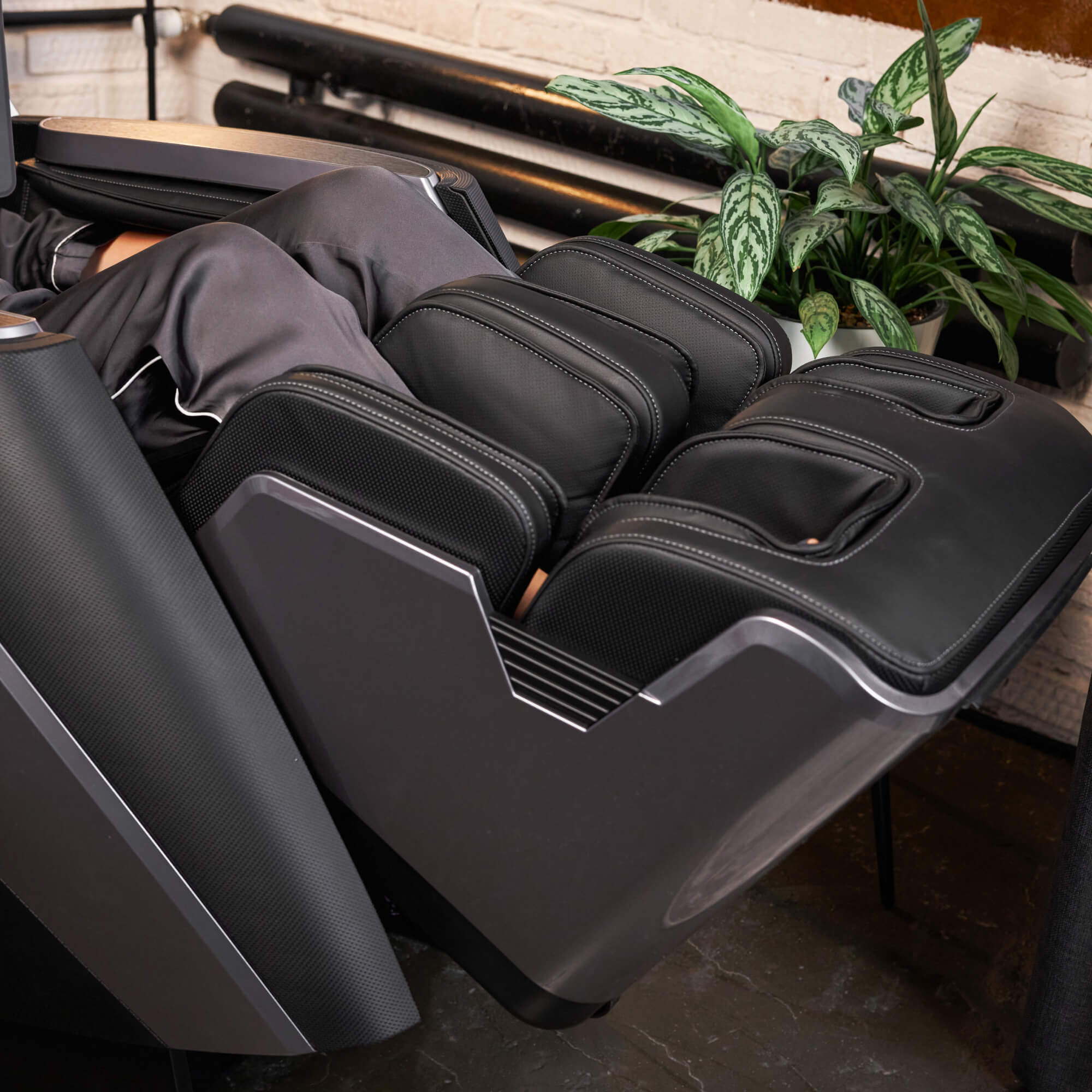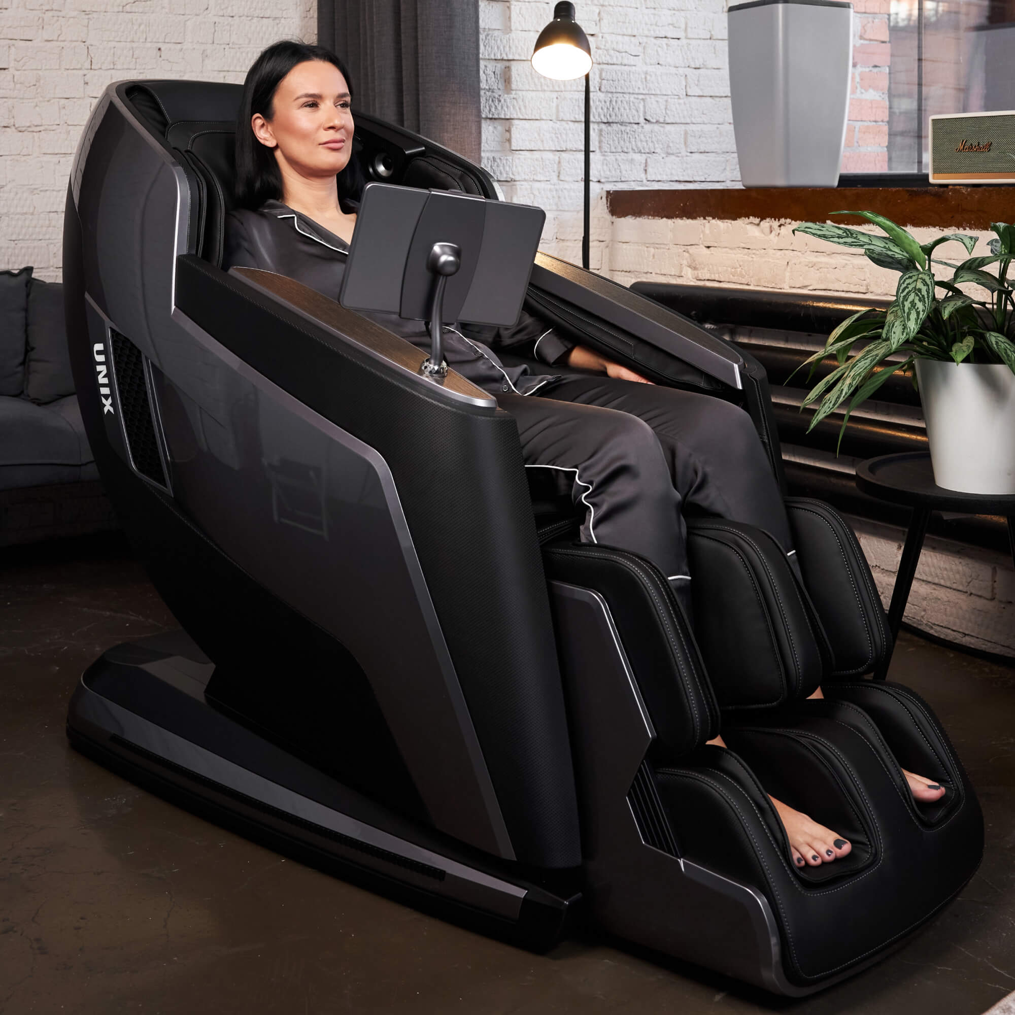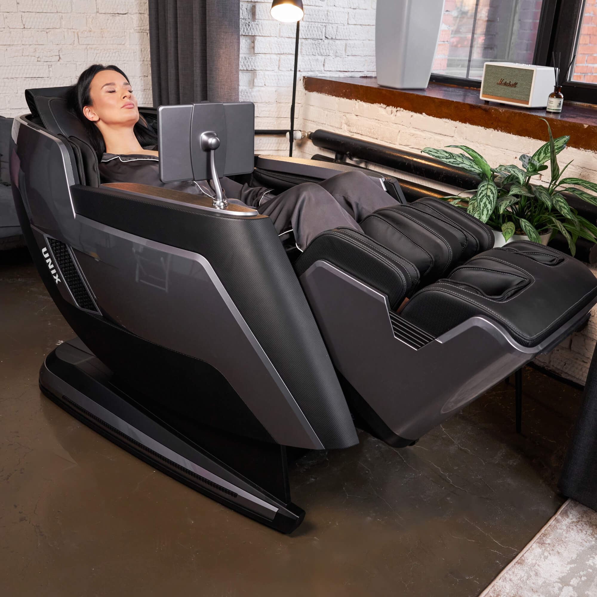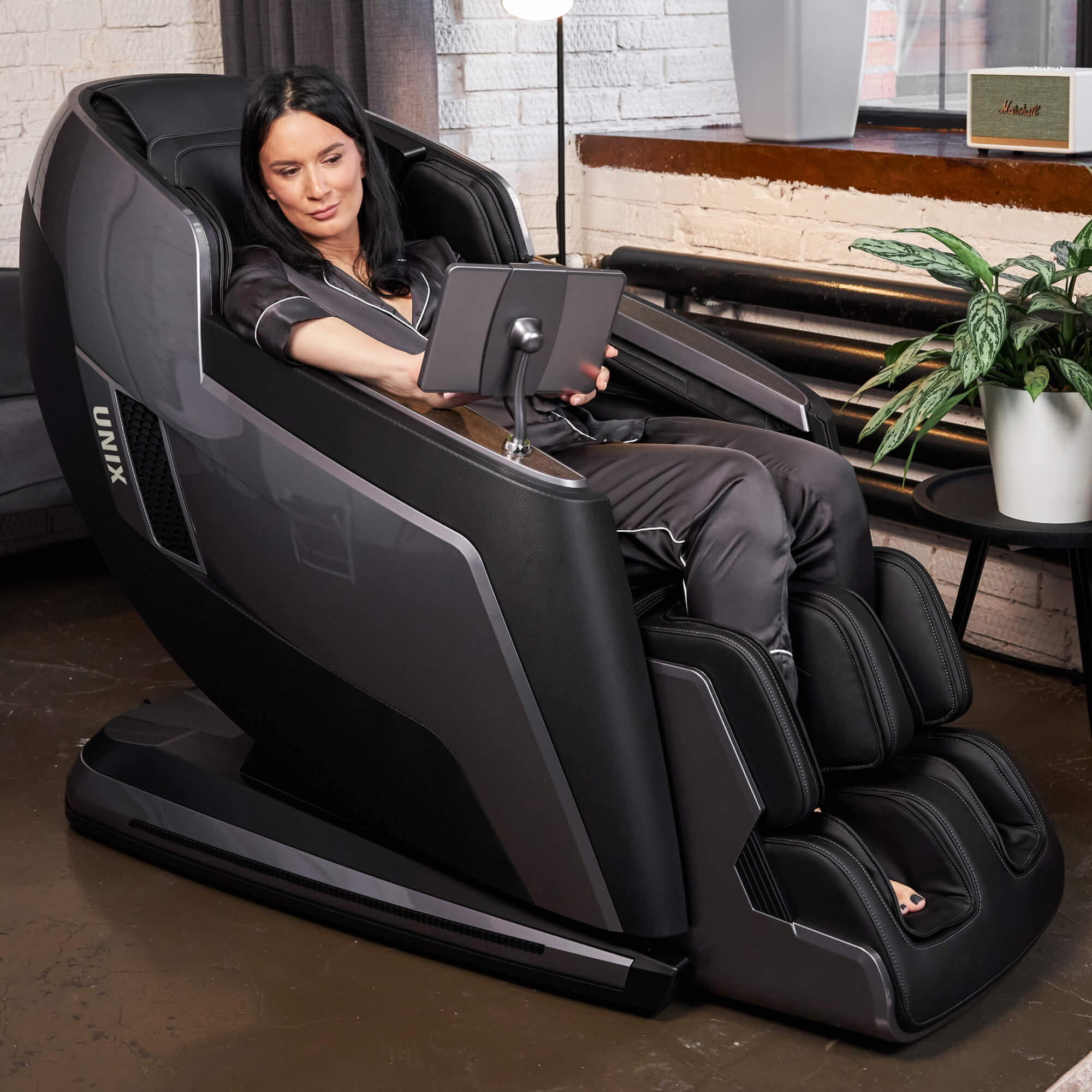 - Воздушно-компрессионные подушки делают массаж ног, икроножных мышц и рук. Они подстраиваются под анатомию пользователя, что поможет быстрее снять неприятные ощущения в мышцах. В массажном кресле UNIX Med Afelia предусмотрена функция роликового массажа ног и массажер для икроножных мышц. Автоматическое выдвижение подставки для ног, а также функции роликов для поднятия и опускания стопы поможет расслабиться после активного дня и борьбы со стрессом.