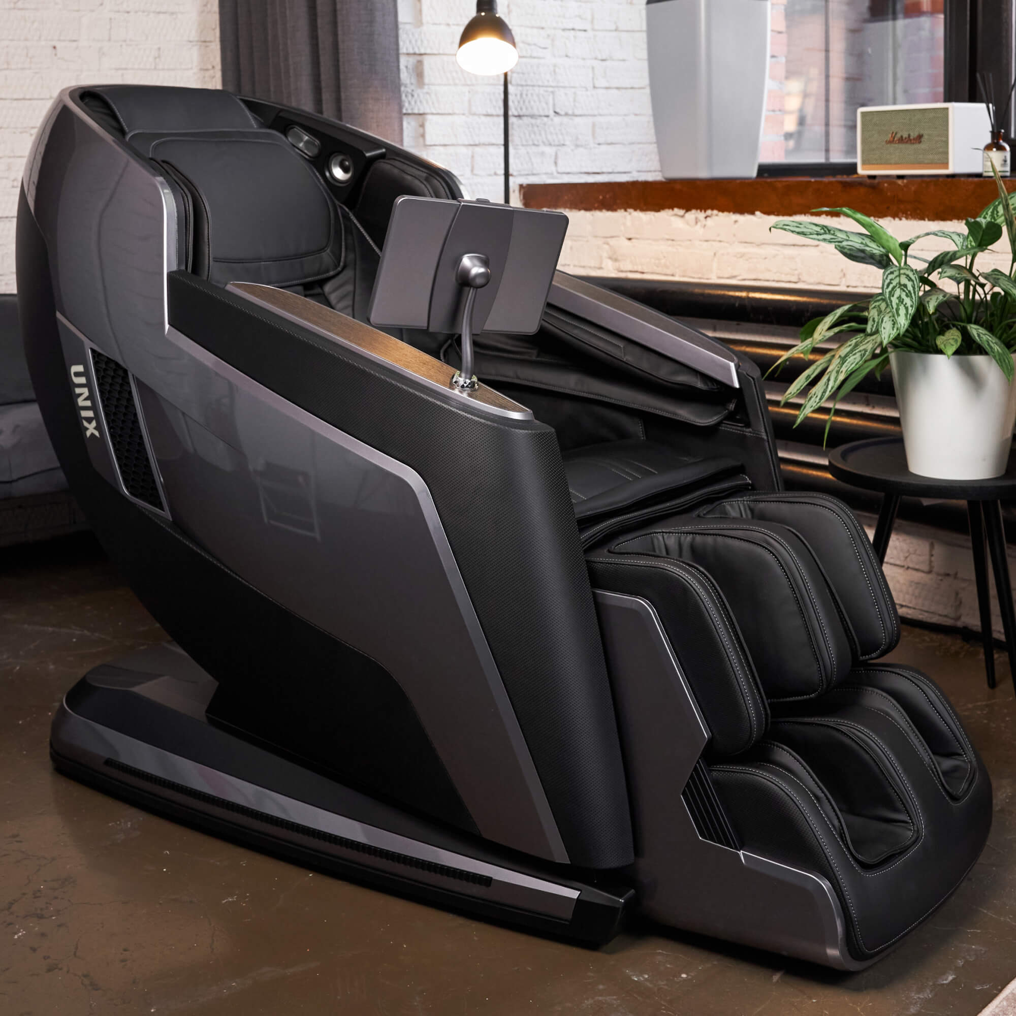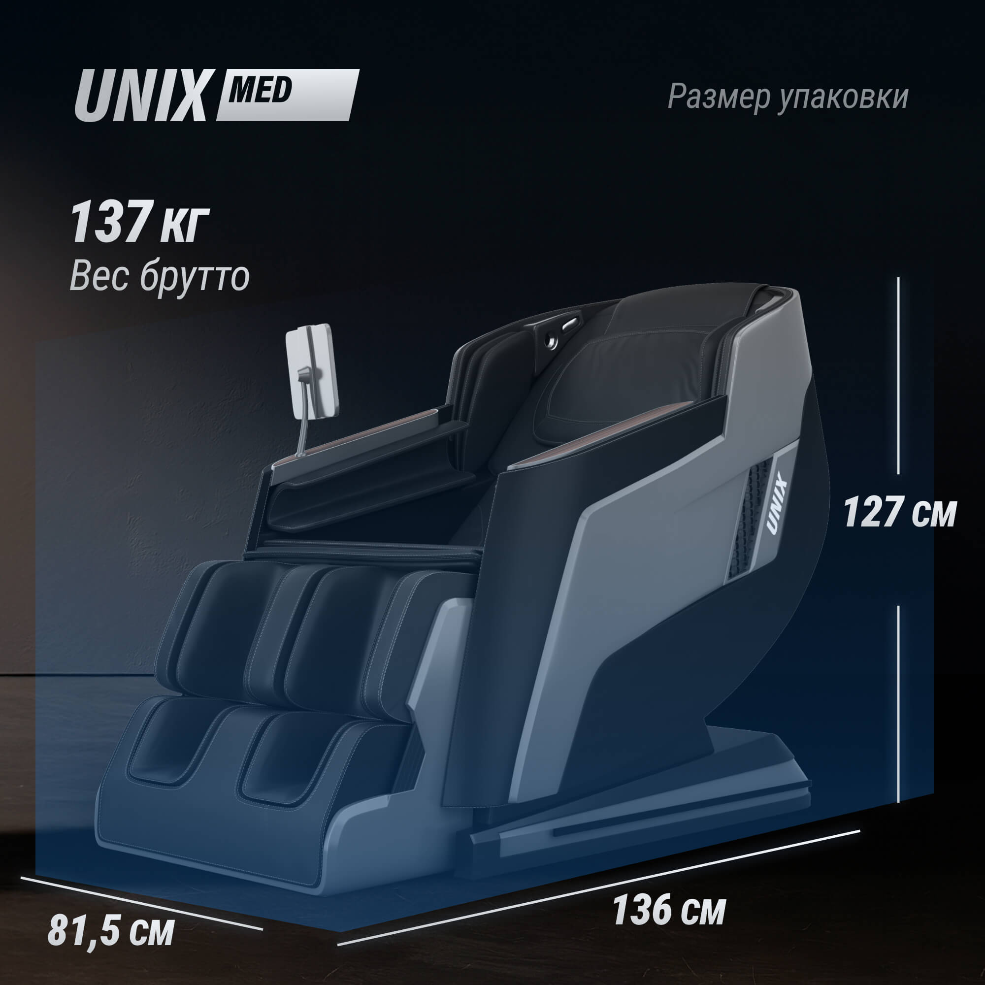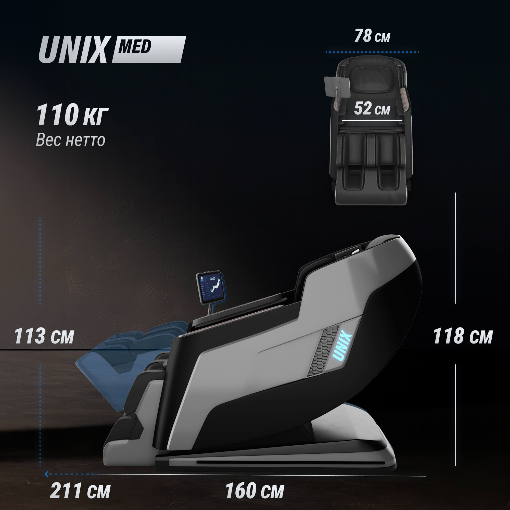 - Функции прогрева. Ролики имеют функцию ИК-прогрева, что делает массаж еще более эффективным. Встроенная система термотерапии расслабляет и успокаивает напряженные мышцы быстрее, подарит комфорт на протяжении всего сеанса. Массажное кресло UNIX Med сочетает в себе функцию подогрева стопы, подлокотников и опоры для ног. Кресло потребляет 260 Вт.