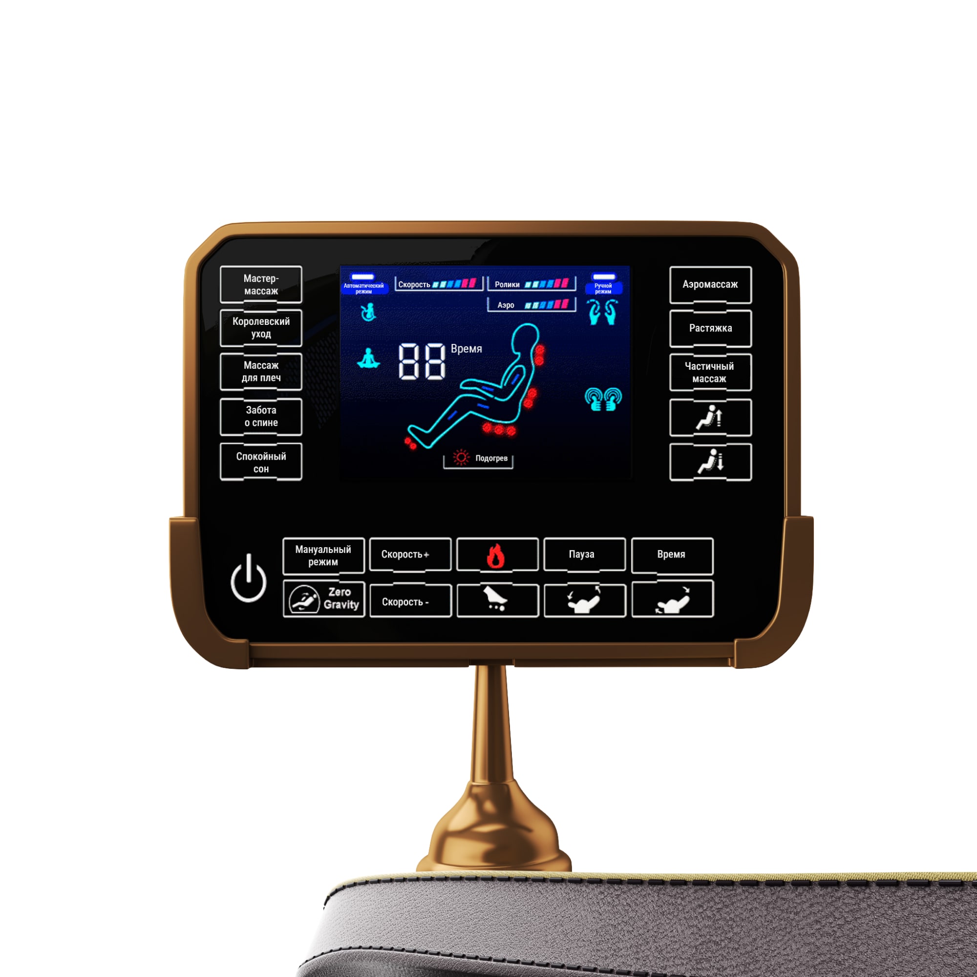 - Управляйте с легкостью! Интуитивно понятный LED дисплей позволяет легко управлять всеми функциями кресла. Вы сможете быстро выбрать нужную программу, регулировать интенсивность массажа и следить за временем сеанса. Яркие и четкие индикаторы делают использование кресла простым и удобным для любого пользователя. С помощью встроенного LED дисплея вы сможете также настроить положение спинки, отрегулировать подъем голеней, а также отрегулировать угол наклона кресла в режиме Zero Gravity, который помогает дополнительно снять усталость с мышц и улучшить кровообращение за счет имитации состояния невесомости. Функция памяти для двух пользователей положения массажера для плеч, интенсивности массажа, положение массажера для икроножных мышц и прочие данные о режиме массажа. При необходимости в меню можно настроить подогрев, роликовые массажеры, яркость экрана, время, язык и отображение состояния. Широкий диапазон изменения уровня давления и времени поможет настроить массажный механизм под свои потребности